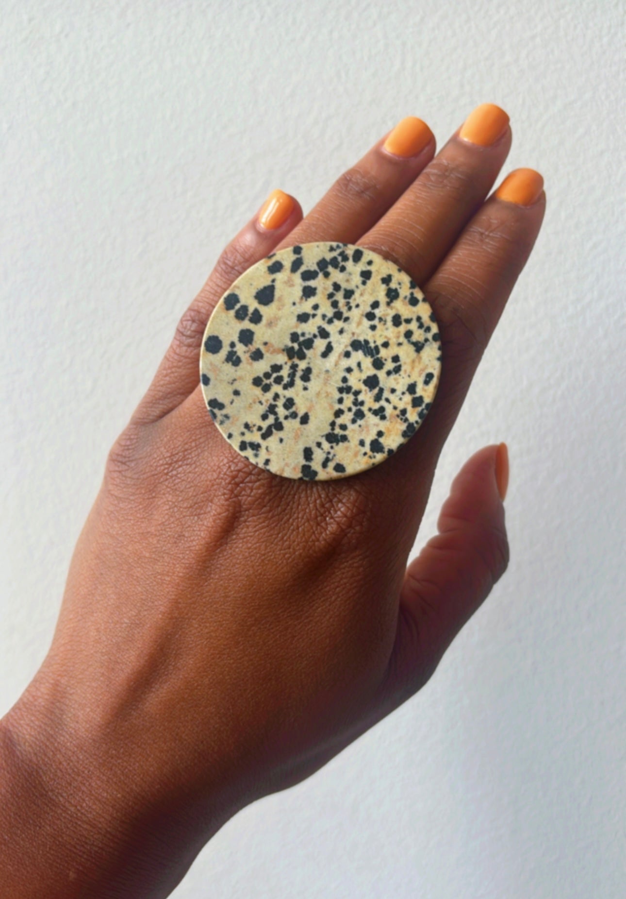 a dalmation round stone on a 20mm gold brass adjustable setting.