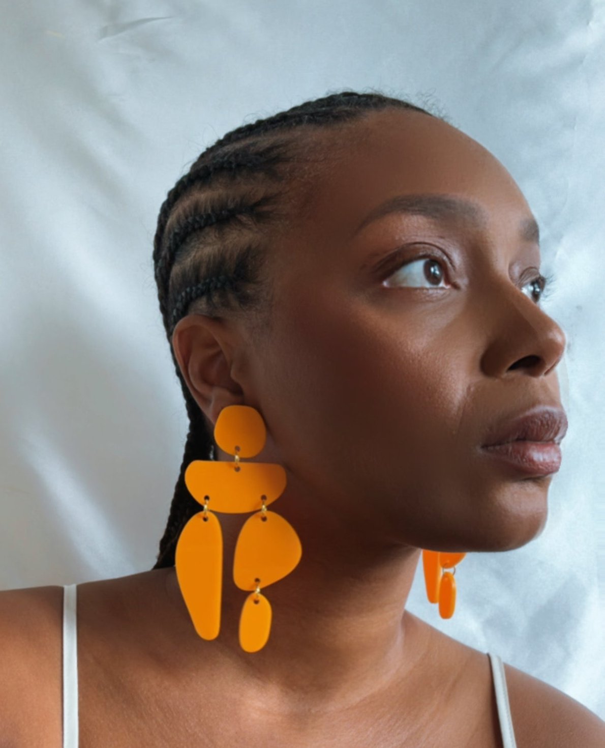 a mandarin linked earring with gold hardware. approximately 4 inches long.