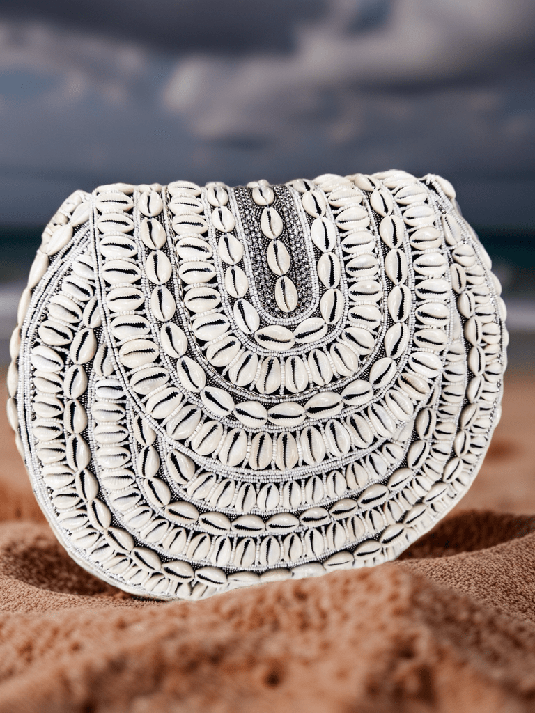 Handcrafted by master artisans, this stunning clutch features hundreds of authentic cowry shells intricately stitched in hypnotic, arching patterns over a firm, structured silhouette. Designed with shimmering glass beads woven between the shells, it catches the light — and every eye in the room.