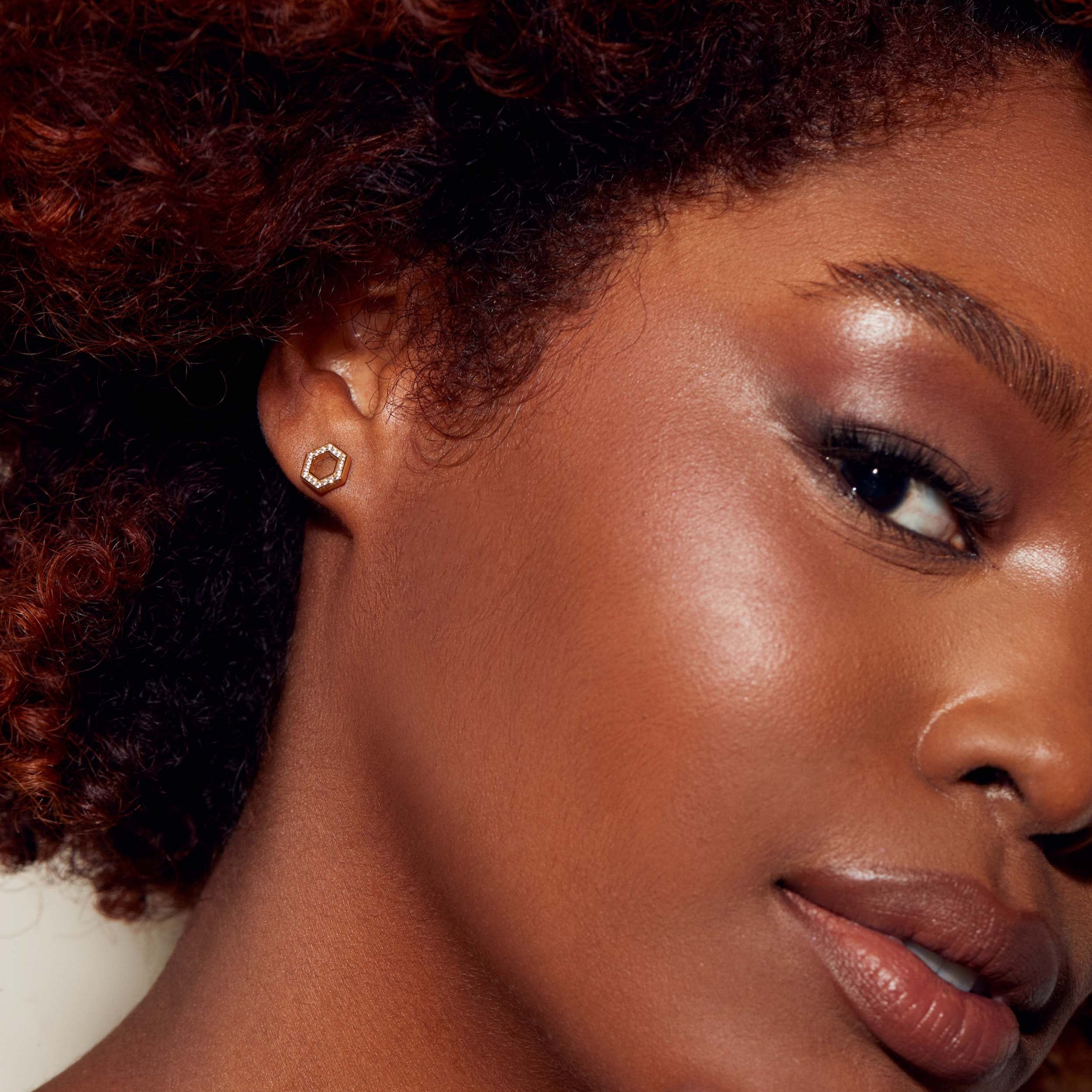 The Olivia Studs turn subtlety into sparkle. Pavé hexagons frame the ear with hard shimmer and clean lines, quiet in scale, bold in effect. The definition of modern elegance.
